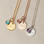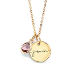 Petite, unique, and absolutely astonishing necklace with name personalized coin and birthstone. Available in three colors: rose gold, gold, and silver. Cam be personalized: choose the birthstone and name for your necklace. The perfect gift for any occasion! Customized with love, it is sure to be a special charm they will treasure for many moments to come.